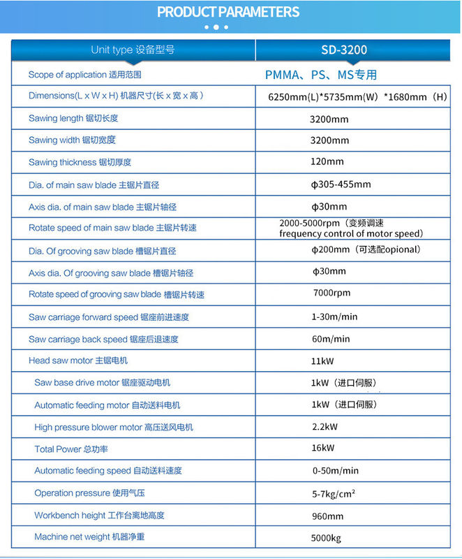 7. El riel guía del asiento de la sierra adopta una marca importada, la rectitud del aserrado< 0,06 mm, con alta precisión y carga pesada, el servocontrol Panasonic se utiliza especialmente para PMMA, MS, PS, PLEXIGLASS, ACRÍLICO, PLÁSTICO.